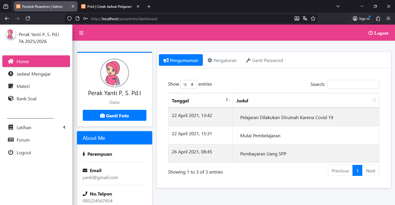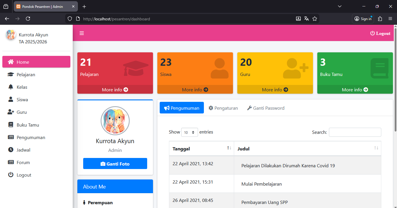 E-Learning Pondok Pesantren KH.Ahmad Dahlan Sipirok adalah E-Learnign berbasis web yang dirancang untuk membantu sekolah dalam memaksimalkan kegiatan belajar mengajar siswa secara digital, rapi, dan efisien. E-Learning ini mengintegrasikan frontend HTML dengan backend (CodeIgniter 3 + Database MySQL) sehingga menghasilkan sistem yang stabil, aman, dan mudah digunakan..