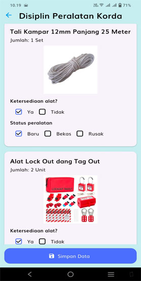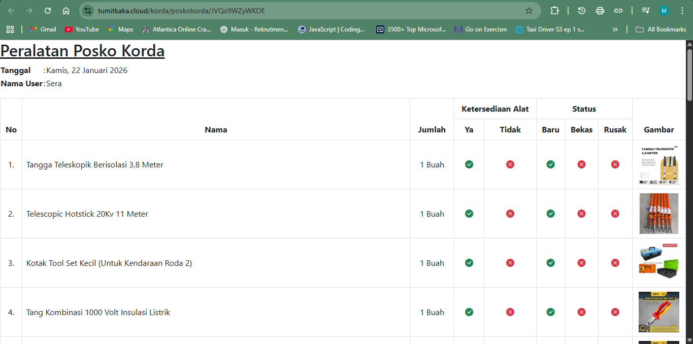 - Kepala posko input pengecekan status alat (Baru, Rusak).